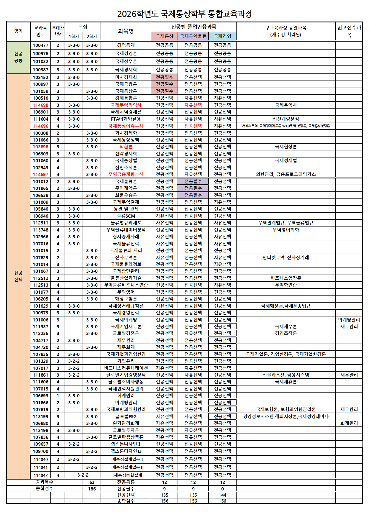 ※ 전공은 개설주관학과가 국제통상학부 교과목만 인정, 동일과목명이여도 타과 개설과목은 "전공 불인정"